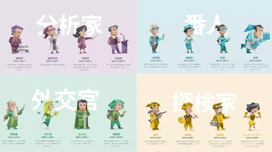 4つの軸の組み合わせにより、16の性格タイプが生まれます。それぞれのタイプには特徴的な傾向がありますが、ここでは4つのグループに分けて簡潔に紹介します。